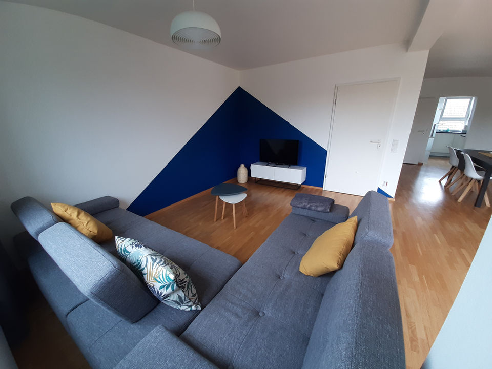 Im ersten OG finden Sie die moderne und vollausgestattete Küche, den großzügigen Wohn-Essbereich mit einer Leseecke und einem gemütlichen Couchbereich mit Kabel-TV. Der große Balkon auf der Südseite der Wohnung mit ausfahrbarer Markise lädt an schönen Tagen zum Entspannen und Sonne tanken ein.